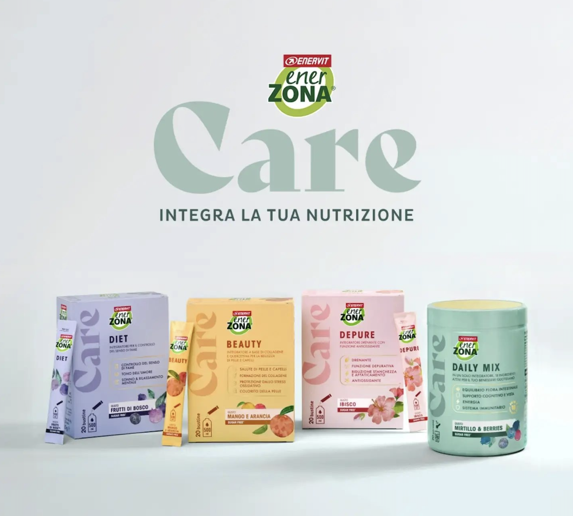 EnerZona Care è la linea di integratori ALL IN 1 pensata per rispondere ai tuoi bisogni quotidiani in modo mirato.